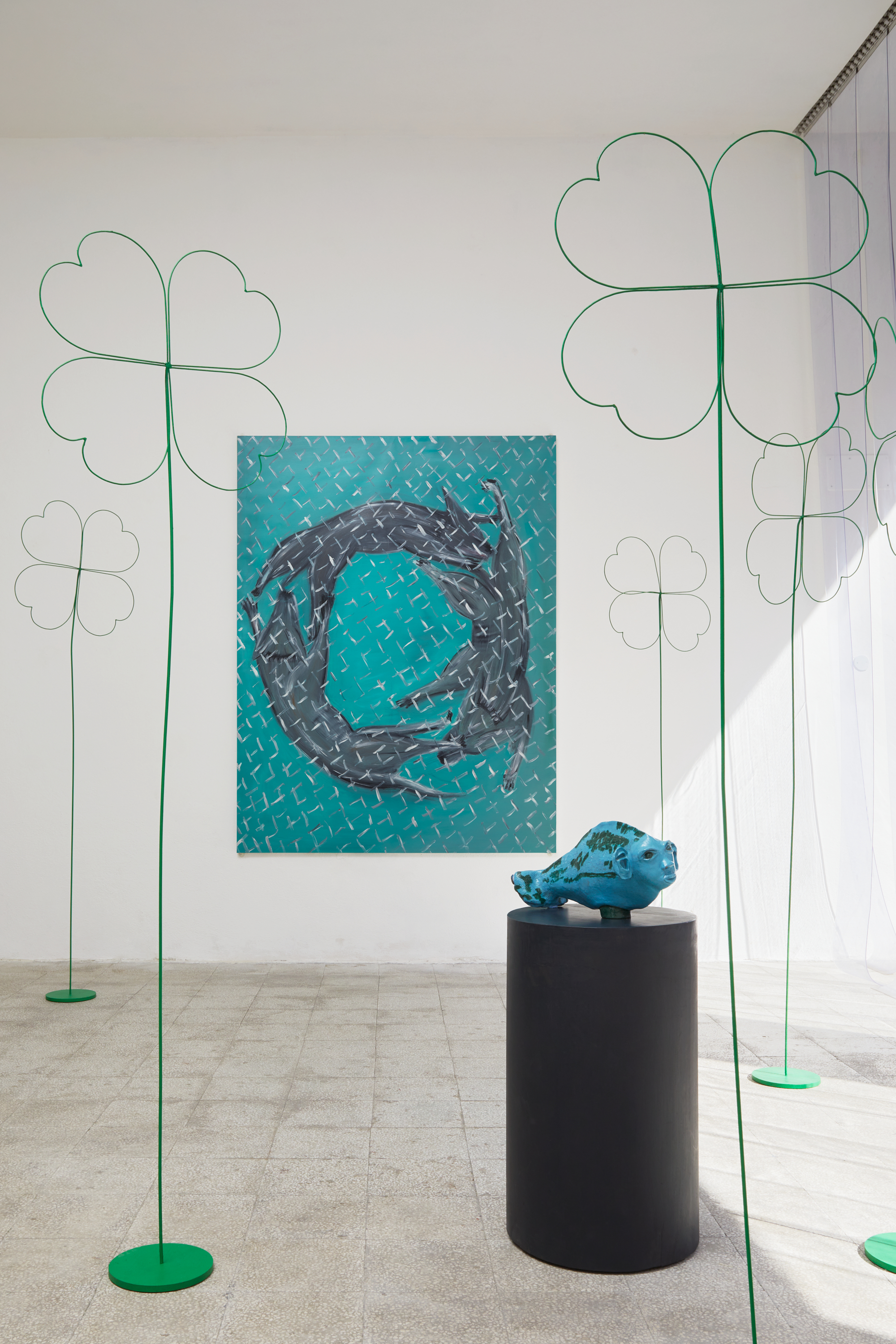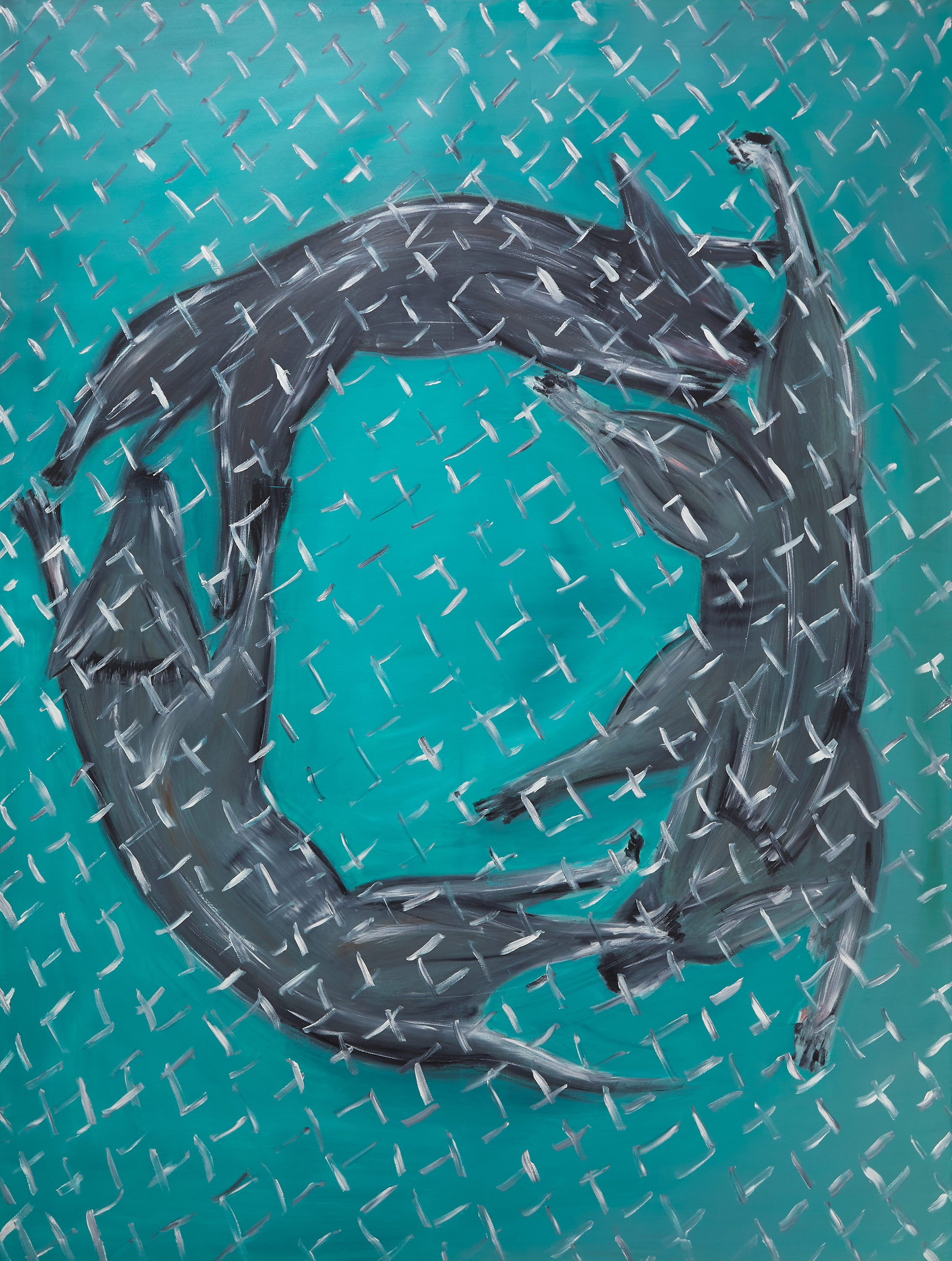 Three ferocious dogs chase each other in a spiral in Michelangelo Menu's oil painting “Three Dogs Running Behind A Fence”, 2025. We look at them through a fence, without interfering.