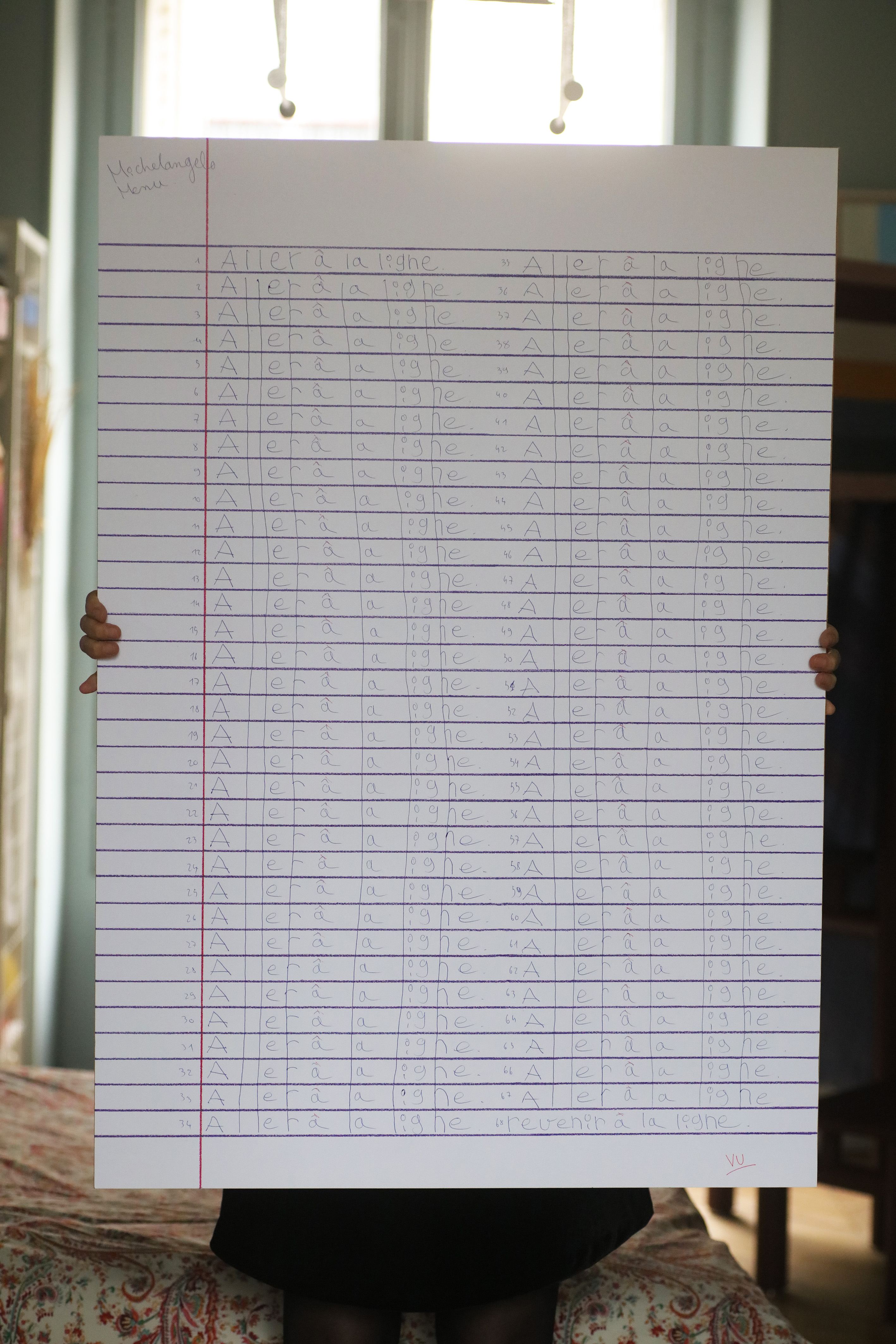 Aller à la ligne is the extra large version of a school punishment. Firstly, a traditional page of a school book was reproduced, in a 100x70 cm format. And then the fastest way to complete this punishment was studied by drawing vertical lines along the page to proceed on the letters (l;r;n), all being composed of a vertical line at their beginning.